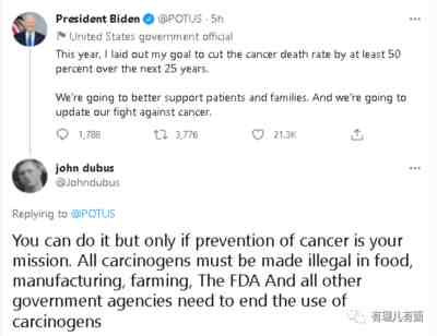 除此之外,一些网友也指出,长期看消灭癌症对人类的困扰是需要的,但现阶段最需要做的是防止更多的人患上癌症,并建议拜登政府,与其推行高昂且短期很难见效的“癌症登月计划”,不如在现阶段加强对癌症的预防,降低致癌物在食品、制造、农业中的使用。