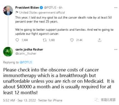 网友B:拜托看看免疫疗法的惊人费用吧,这是一项医学突破,但除非你有钱或者享受着医疗补助,否则根本负担不起,不然一个月就要花大概4万美元,而且疗程至少要持续1年以上!