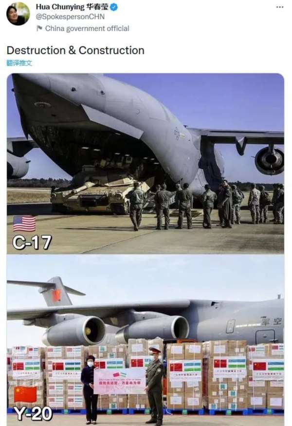 最后,分享一张对比图吧:美国军队用运输机C-17向境外输送坦克PK中国用运-20为乌兹别克斯坦援助防疫物资。