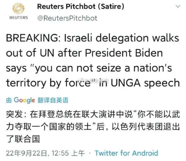 第二句话,在美西网络平台上立即出现一个段子,极其生动的进行了解析:拜登在联合国大会上说出“没有任何国家可以用武力夺取另一个国家的领土”这句话之后,以色列代表团退出了联合国。