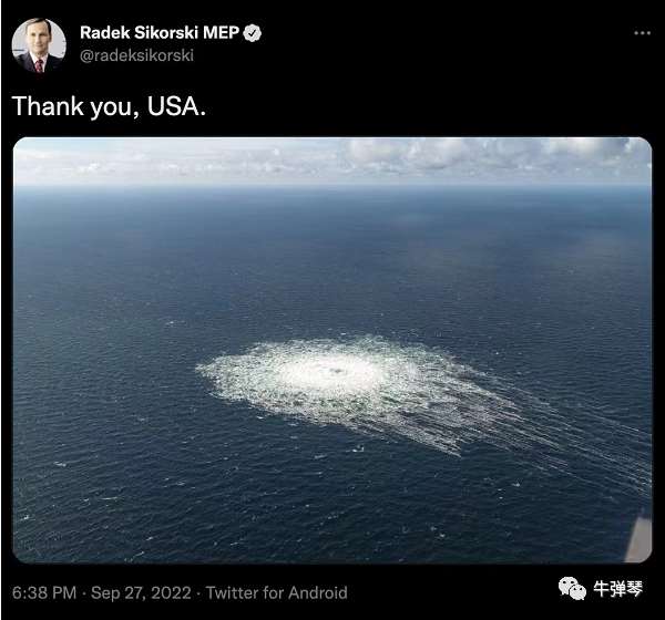 更有意思的,波兰前外交部长西科尔斯基发推,就一张海面爆炸图,上面配了一句话:谢谢你,美国(Thank you, USA)。