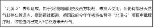 北溪2号在去年底建成后,于今年2月被德国政府宣布暂停,这个时候北溪2号管道内已经充入3亿立方米天然气。