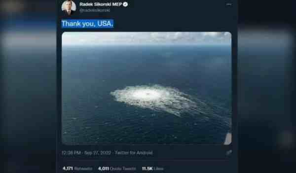 在管道爆炸事件发生后,一段俄乌战争前拜登威胁北溪管道的讲话就在网上疯传,懂王还亲自转发,而欧洲议会议员、波兰前外长西科尔斯基就第一时间转发了事故现场照片并配文道:谢谢你美国。
