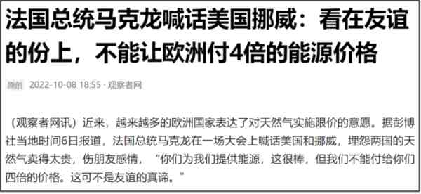 感情马克龙直到现在才后知后觉,意识到美国一直卖4倍价格的天然气给欧洲,这不是在帮助欧洲,只是在狠宰冤大头而已。