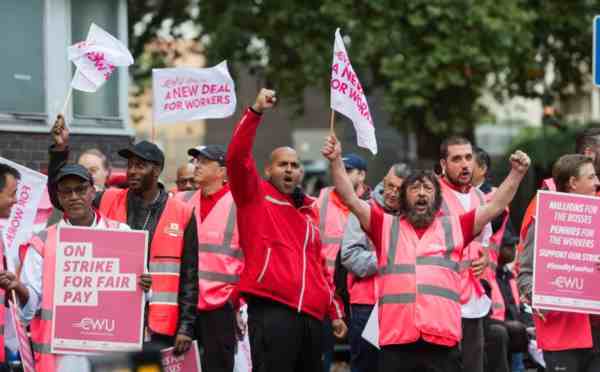 当地时间2022年9月8日,英国伦敦,罢工的皇家邮政工人聚集在卡姆登镇投递办公室外的纠察线上,他们就持续的工资纠纷展开了48小时的罢工行动。