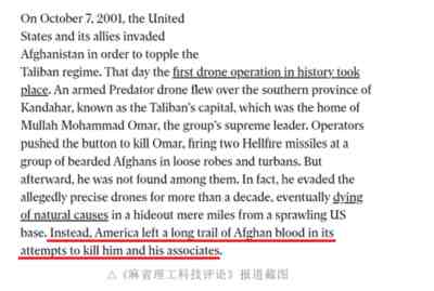 《麻省理工科技评论》的报道指出,十几年间,在美军“试图杀死奥马尔和他的同伙时,留下了一长串阿富汗平民的鲜血”。