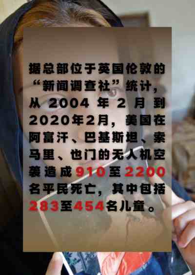 而据英国非盈利组织新闻调查社统计,2004年2月-2020年2月,美国在阿富汗、巴基斯坦、索马里、也门的无人机空袭,造成910-2200名平民死亡,其中包括283-454名儿童。