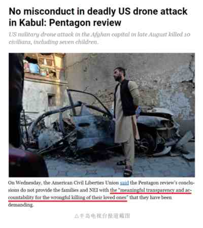 更离谱的是,《纽约时报》和《华盛顿邮报》等美国媒体后来调查发现,这次攻击中被炸死的艾哈迈迪非但不是恐怖分子,还是美国一个援助组织的长期雇员,所谓“可能是炸药的物品”,也不过是桶装水。
