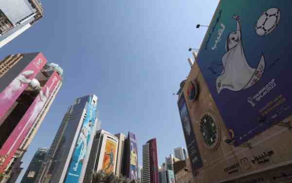 当地时间2022年10月11日,卡塔尔多哈,2022卡塔尔世界杯前瞻,组委会用球员画像海报装扮建筑物