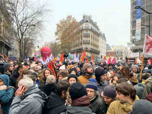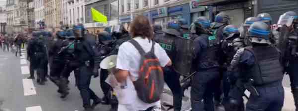 游行队伍遭到法国警察喷射辣椒水,双方暴发冲突。