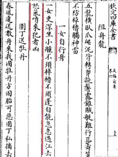 书中是这样描述的:一女自行舟,一女更深坐小艟,不须棹橹不须蓬。自能急急过江去,怒气喷来犯者凶。