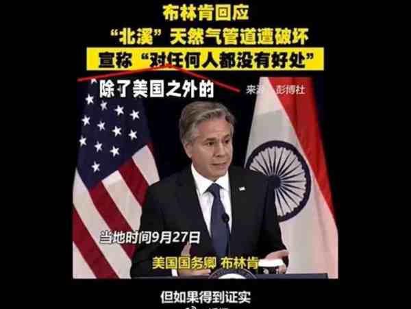 北溪被炸后,美国国务卿布林肯做出表态,管道泄漏,不会对任何人的利益有利。