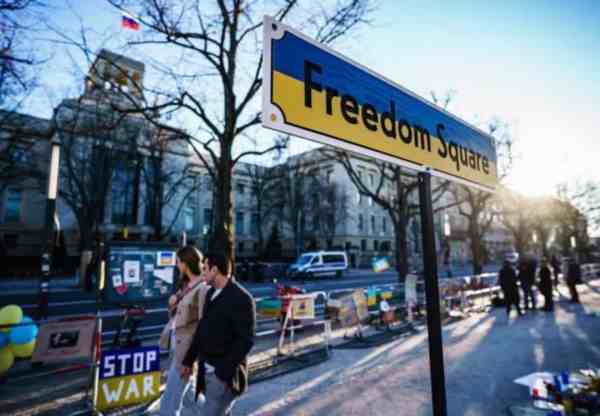 位于柏林的俄罗斯驻德大使馆外,沿路的路障被民众挂满了反战装饰,一条毯子摊在地上,上面堆满了玩具,提醒人们关爱战争中的乌克兰儿童。