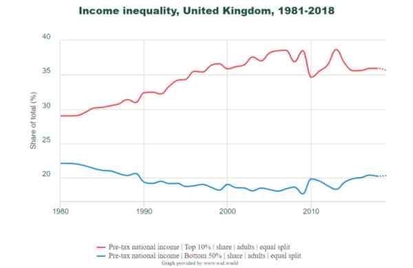 英国收入不平等的变迁,红色为最富裕的10%人口的收入占比,蓝色为最贫穷的50%人口的收入占比(来源:世界不平等数据库)