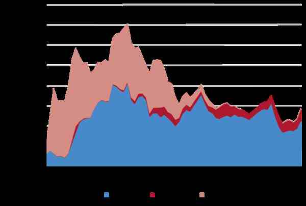 战后英国新建住房情况,其中浅红色为公屋,深红色为住房协会房屋,蓝色为商品房(来源:英国上议院经济事务委员会)