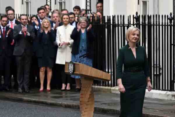 当地时间2022年10月25日,英国伦敦,即将离任的英国首相特拉斯在唐宁街10号发表了最后一场演讲后离开讲台,随后前往白金汉宫递交辞呈。