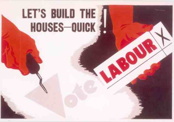 1945年7月,德国已经投降,原子弹尚未在日本落下,受够了战时配给制和经济困难的英国人迎来了1935年以来的第一次大选。作为战时领袖威望如日中天的丘吉尔迫不及待地开始攻击意识形态对手。他暗中命总参谋部制定了德日投降后对苏联开战的“不可思议计划”,又在选战中叫嚷工党“将会像盖世太保那样”在英国实行社会主义。但在另一方,工党提出了“让我们直面未来(Let us face the future)”的口号。一幅工党的竞选海报更直白地讲出了他们的计划:“咱们赶紧盖房子!”