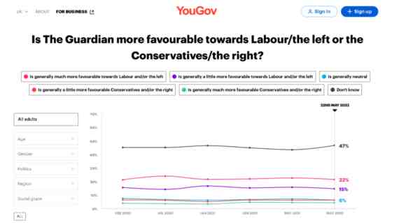 当然,《卫报》会这么“找茬”苏纳克,可能也与其“立场”有关。英国民调机构YouGov的今年5月的一项民调就显示,有总计37%的受访者认为《卫报》的“立场”是偏向英国在野党工党的,仅6%的受访者认为该报的“立场客观”,还有47%的受访者表示说不清。一些英国的论坛上也普遍认为该报是亲工党或反目前执政的保守党的。