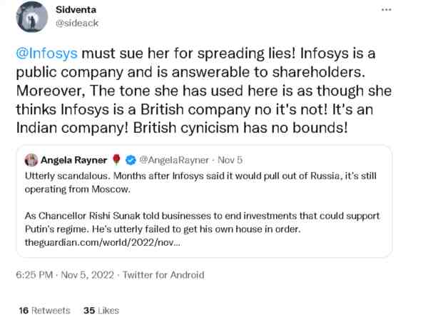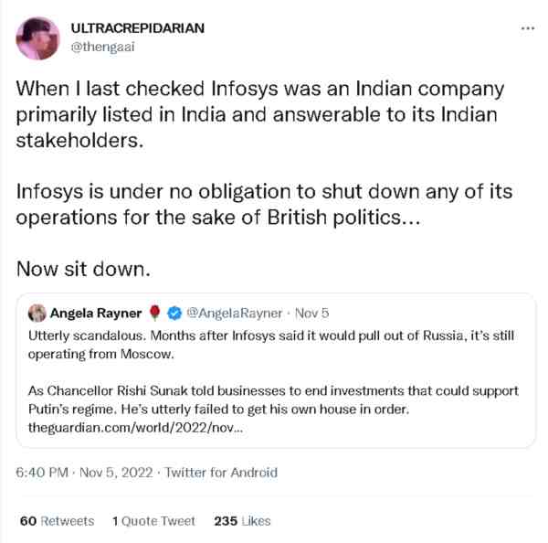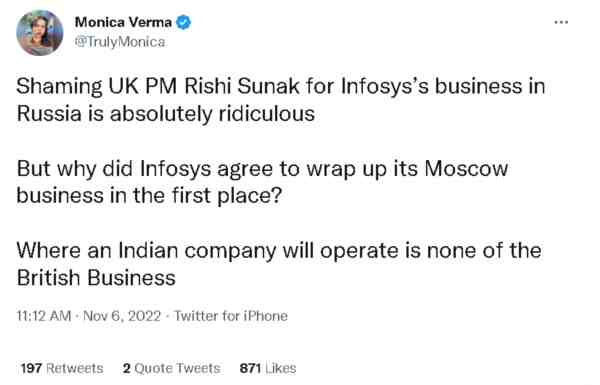 因为在他们看来,印孚瑟斯明明是一家印度企业,有选择在哪里投资,和谁做生意的自由,英国人管不着,可英国人却用这家印度企业在俄罗斯的业务来攻击身为印度裔的苏纳克,这明显不仅是冲着苏纳克来的,更是冲着印度来的。