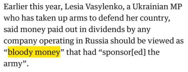 而且,或许是还嫌不够挑事,《卫报》还在这篇文章中引用一名乌克兰政客的话说,任何从俄罗斯赚钱的企业,赚的都是“沾满人血的钱”。