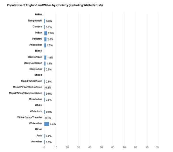 注1:美国《纽约时报》在2022年10月24日的一篇报道中介绍说,英国的英格兰和威尔士地区总计生活着150万印度裔,这令印度裔成为了英国白人之外英国最大的民族群体。英国政府官网给出的数据也显示印度裔是除白人外英国最大的民族群体。