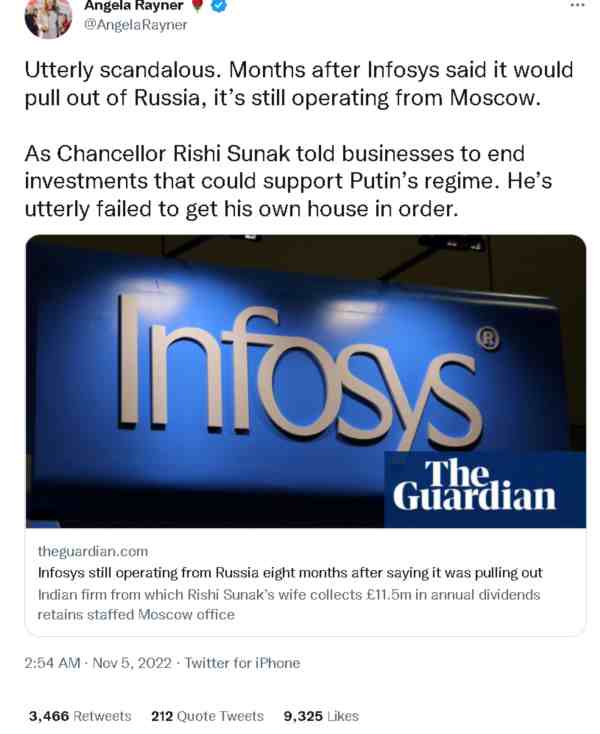 同时,《卫报》还强调说,苏纳克的妻子阿克萨塔·穆尔蒂,仍在从她持有的印孚瑟斯公司的股份中获得分红——换言之,这意味着当今英国首相的妻子,竟然在从一家与俄罗斯做生意的企业那里获利。