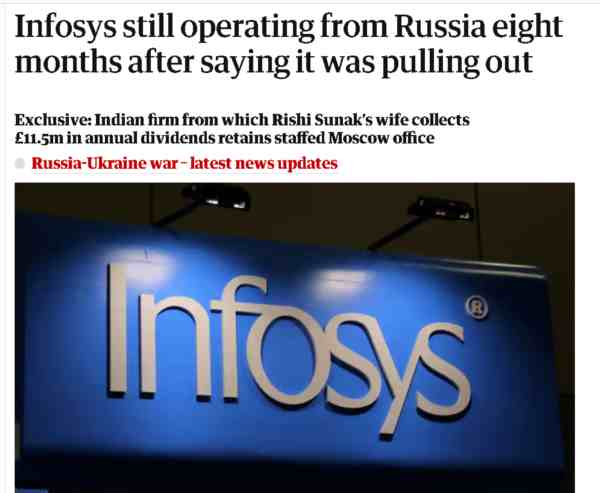 原来,英国《卫报》在当地时间11月4日爆出了一则“猛料”,称由苏纳克的岳父纳拉亚纳·穆尔蒂创建的印度著名IT公司印孚瑟斯(Infosys),虽然曾在数月前表示公司会撤出与乌克兰交战的俄罗斯,可实际上该公司仍然在俄罗斯首都莫斯科留有一处办公室,而且仍然在开展业务。