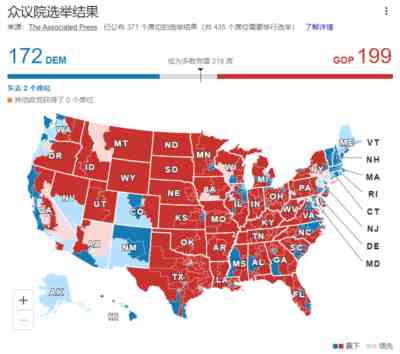 根据美联社统计,截至美国时间11月9日凌晨,众议院席位,共和党人已经夺得199席,领先民主党的172席——任何一党赢得218席就将成为众议院多数党。