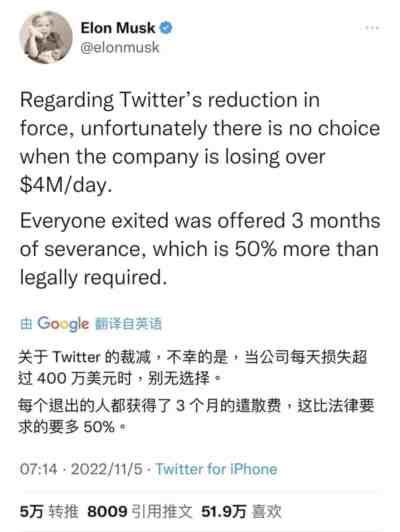 被裁的部分员工发起集体诉讼,起诉推特。对此马斯克还解释说,推特每天亏损近400万美元,除了裁员别无选择。还称每个被裁的员工都得到了3个月的遣散费,比法律要求的多50%!言下之意,被裁还要感谢他。