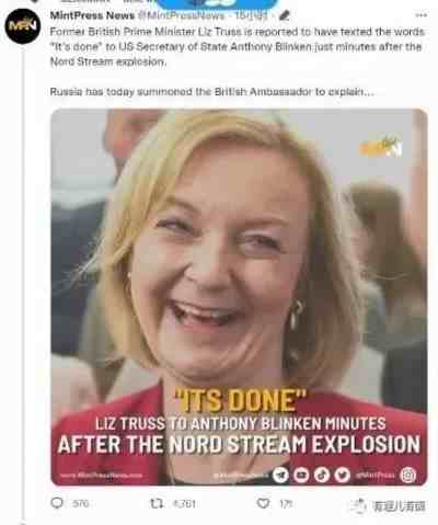 据俄媒报道,俄罗斯黑客入侵了特拉斯的通讯工具并获取数据,其中有一条特拉斯发给布林肯的短信写道“都搞定了”,短信发出后“北溪’管道就爆炸了”。