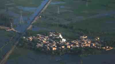 当地时间2022年9月9日,巴基斯坦信德省,航拍苏库尔郊区被洪水淹没的地区。