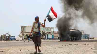 当地时间2019年8月30日,也门南部阿比扬省,“安全地带”部队的一名战士举着分裂分子的旗帜走过一艘油轮。