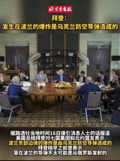 路透社当地时间11月16日援引消息人士的话报道,美国总统拜登对七国集团和北约盟友表示,波兰东部边境的爆炸是由乌克兰防空导弹造成的。拜登还曾表示,落在波兰的导弹不太可能是从俄罗斯发射的。同日,美国国家安全委员会发言人艾德丽安·沃森发表声明称,美国“没有看到任何与(波兰)总统杜达的初步评估相矛盾的地方”,即这次爆炸很可能是由乌克兰防空导弹造成的。