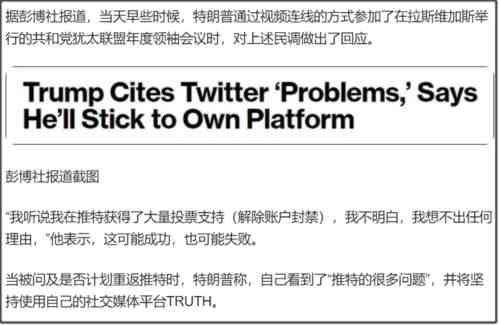 就在昨天,特朗普在出席活动时被问询是否计划回归推特,他回答道,“我看不出有任何理由”。