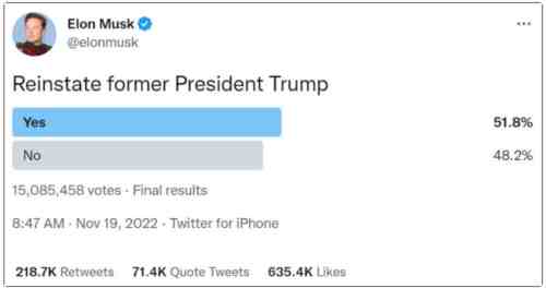 马斯克首先是发了个投票,由用户抉择是否恢复前总统特朗普的账号。