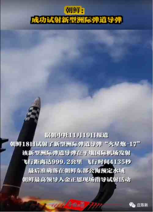 新华社首尔11月19日电 ,朝鲜18日试射新型洲际弹道导弹,朝鲜最高领导人金正恩现场指导试射活动。报道说,“火星炮-17”型新型洲际弹道导弹在平壤国际机场发射,飞行距离达999.2公里,飞行时间4135秒,最后准确落在朝鲜东部公海预定水域。金正恩说,此次试射活动再次确认,朝鲜核武装力量能够遏制任何核威胁。他表示,近期美国等势力在朝鲜周边的军事威胁更加迫切要求朝方“实质性加快升级压倒性的核遏制力”。