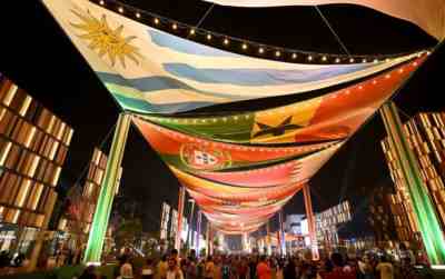 2022年11月19日,卡塔尔多哈,2022年卡塔尔世界杯开幕前,球迷们聚集在卢塞尔大道球迷区。