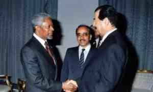 为此,他冒着危险飞往伊拉克首都巴格达会见萨达姆,还邀请萨达姆抽雪茄,萨达姆犹豫了一下,还是接了过去,并且说:“我从来不与联合国的人一起抽烟,你是一个例外。”