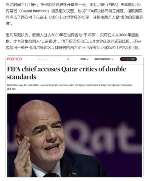 还是这届世界杯,面对西方政客、媒体对卡塔尔世界杯排山倒海的政治攻势,连国际足联主席因凡蒂诺都忍不住说出了“我们欧洲人太爱给人上课了。欧洲人过去3000年在这个世界上做的事情,我们得道歉3000年,才有资格道德说教。”在因凡蒂诺说看来,他6年前就来到这里,看到太多欧洲企业在这里捞金。他们提出过劳工问题吗?没有,因为那意味着收益减少。”