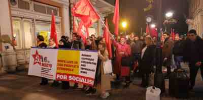 周六,代表们参加了在贝尔格莱德市中心举行的游行,游行的横幅是:“希望人民为社会主义而斗争,反对资本主义剥削和帝国主义战争。”