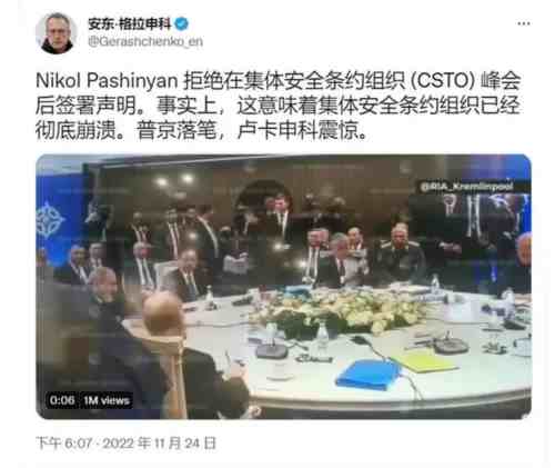 2022年11月23日,普京在亚美尼亚召开的集安组织(“独联体集体安全条约组织”)峰会上再遭挫折:当日,亚美尼亚总理帕西尼扬拒绝在联合声明上签字,这让普京当众下不来台,气得直接扔笔。