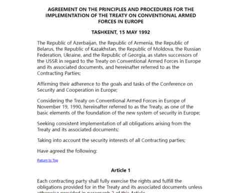 最终,该条约于1994年4月20日完成国家批准程序后正式生效,并确定了基本宗旨:建立独联体国家集体防御空间和提高联合防御能力,防止并调解独联体国家内部及独联体地区性武力争端。