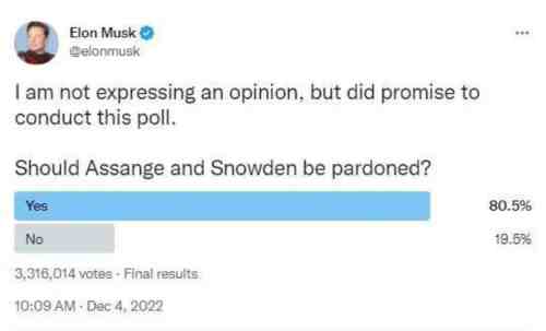 美国当地时间12月3日,马斯克在推特上发起关于美国人是否支持赦免美国国安局承包商前雇员爱德华·斯诺登和维基解密联合创始人朱利安·阿桑奇的投票,结果显示80.5%的投票者支持赦免这两人。
