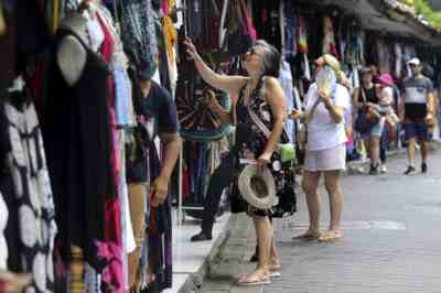 当地时间2022年11月12日,印度尼西亚巴厘岛,外国游客在购买纪念品。视觉中国 图
