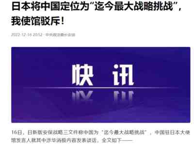 最让人气愤的是,日本的这三份安保文件将中国定位为“迄今最大战略挑战”,狂妄地指责中国在台海地区军演发射导弹对当地居民构成“威胁”,无耻地给中方贴上“经济胁迫”等标签。——这是典型的倒打一耙。从来都是日本威胁中国,而不是中国威胁日本。