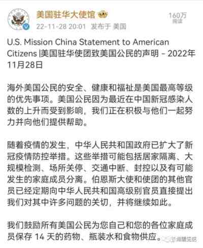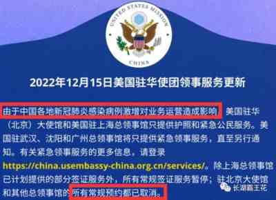 我相信12月7日的新十条的出台肯定是个艰难的决策,背后一定有各种各样的推动力。那些哭着叫着要放开,没有一点耐心,一秒钟都不愿意等待的人,自然是12月7日就提前放开的推动力之一,但是更重要的,中国三年的严格防控,让美国始终没有下手的机会,现在推动放开,发现机会开始出手了。首先是美国驻华大使馆来第一波操作:暂停了所有赴美签证业务。