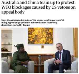 12月24日,《卫报》发布专题文章“澳大利亚和中国联手抗议美国否决上诉机构导致世贸组织瘫痪”,介绍中澳等127个国家联合提案,抗议美国长期阻扰WTO上诉机构法官任命,导致上诉机构瘫痪3年,要求立即开启法官遴选,尽快恢复WTO上诉机构的正常运行。