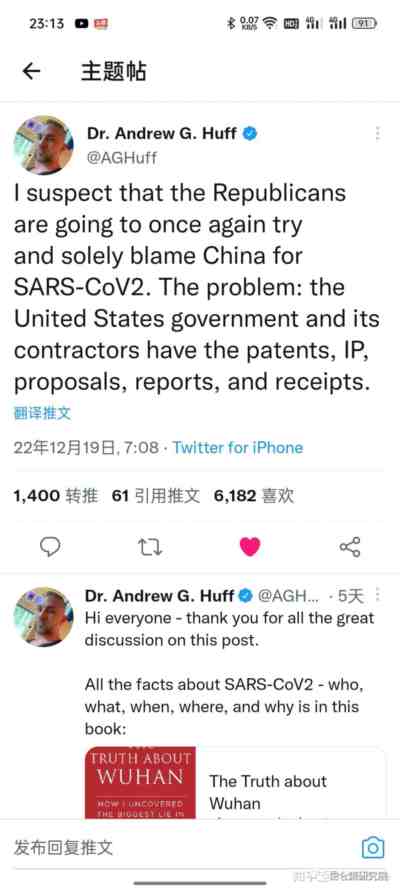 这还没完,以上这些事情已被越来越多的人知晓,Twitter上这些天该话题被锤爆了,是因为有个美国博士(Andrew Huff)出了一本书"The truth about Wuhan"详细介绍了美国资助、制造冠状病毒的实证,包含病毒改造论文/专利、疫苗专利等,而这些论文和专利都早于大流行。