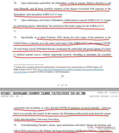 控告书还提到Daszak为混淆大众视听专门投书Lancet把COVID-19说成自然的,另外提到Daszak2019年夏天到Wu Han时其已经出现COVID-19症状,此人是一名“潜伏”Wu Han多年的美国科学家!