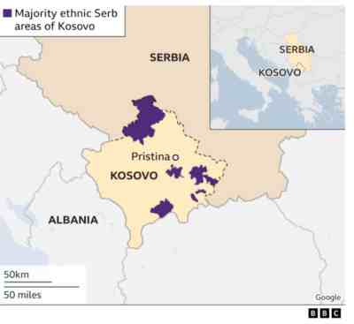 12月27日BBC在报道中使用的地图,把科索沃划到了塞尔维亚之外,图中紫色部分是塞族在科索沃的聚居区。